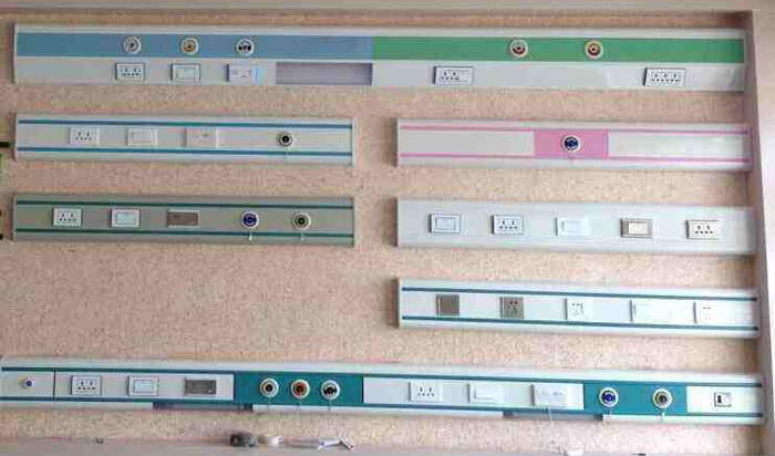 4,可根据工程需要,设置中心供氧及负压吸引等气体出口,也可配置空气等出口,也可配置空气等出口 可选配照明灯(每个床头上配置一只,系philips日光灯系列),照明灯长度180mm 每段上标配一只电源插座和一只开关,若还需要其它电气设备(如音视频插孔等)。